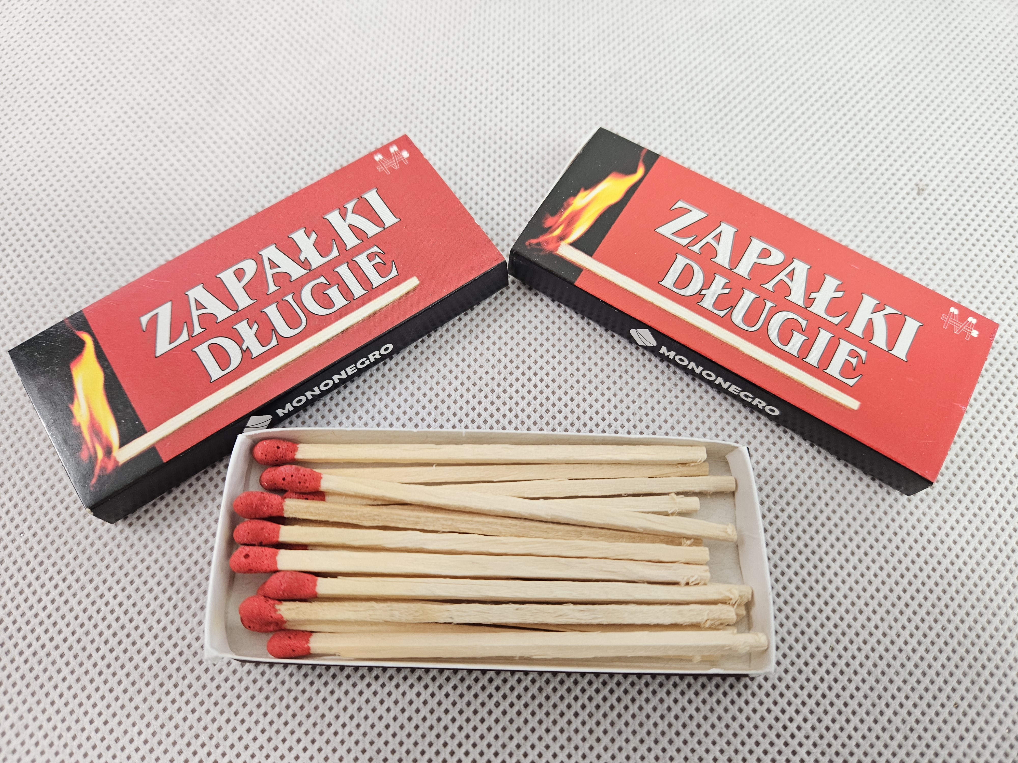 Zapałki długie . 15 sztuk w opakowaniu. Wymiary opakowania : 8,5x 3,5 cm. pak. 10