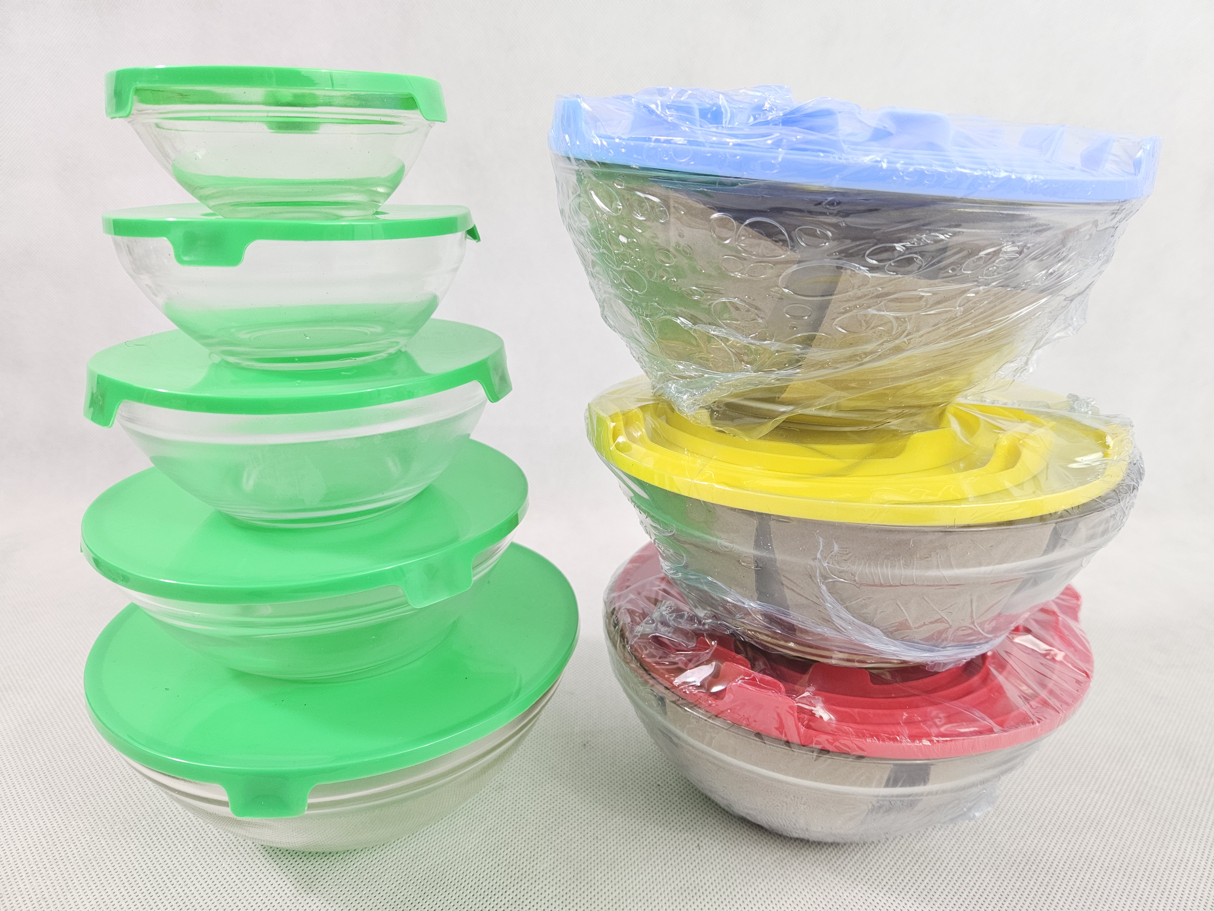 Komplet pięciu sztuk misek szklanych z przykrywkami plastikowymi. Średnice misek : 17cm, 14cm, 12,5cm, 10,5cm, 9 cm. mix kolorów. pak. 16/luz