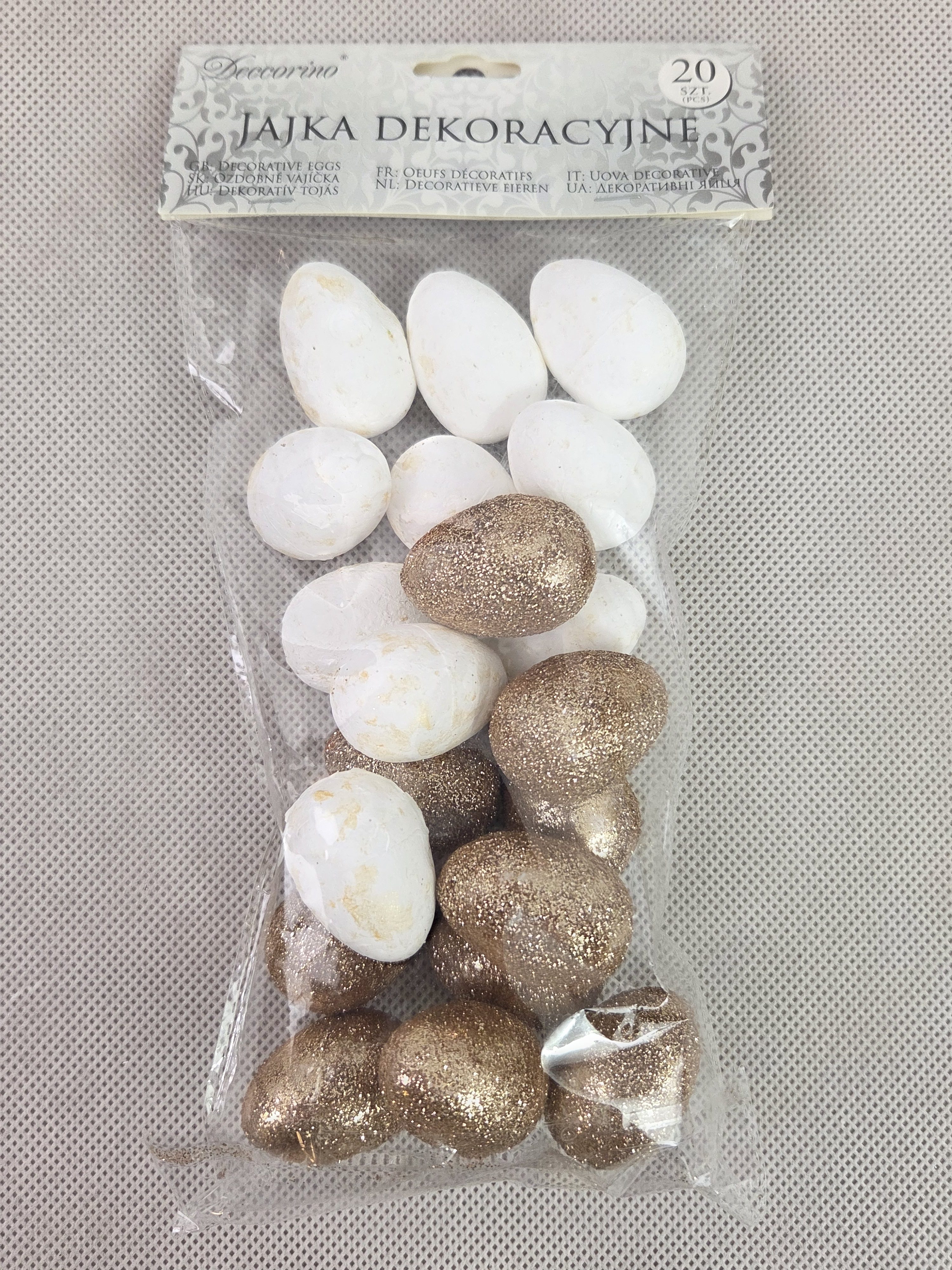 Zestaw 20 sztuk jajek do zawieszenia . Tylko kolor biały i złoty. Wysokość jajek : 3,5 cm.  pak. 120/luz