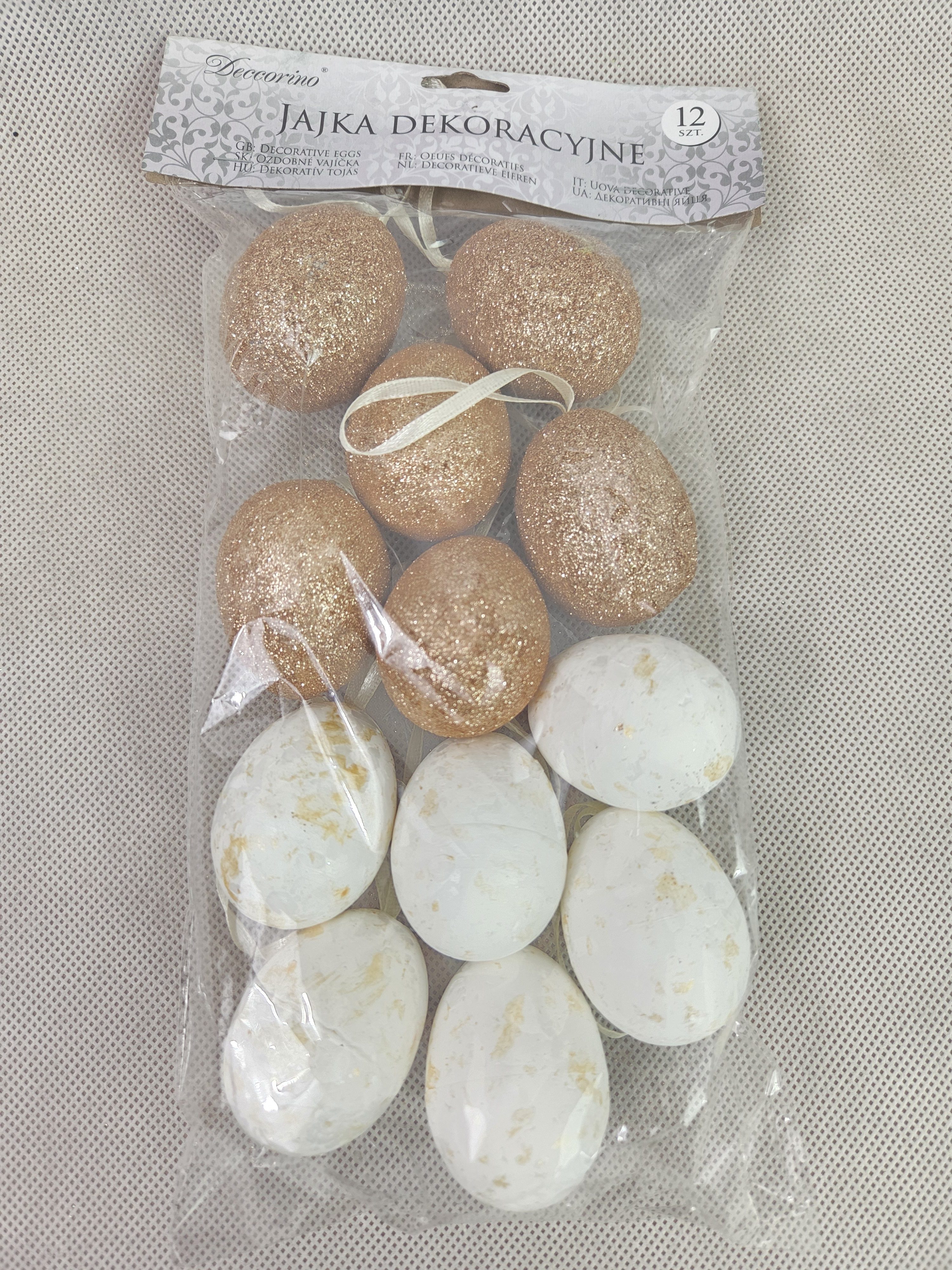 Jajka dekoracyjne 12 sztuk w zestawie. Wielkość jajka : 4×5,5 cm. Kolory złoty i biały. pak. 120/luz