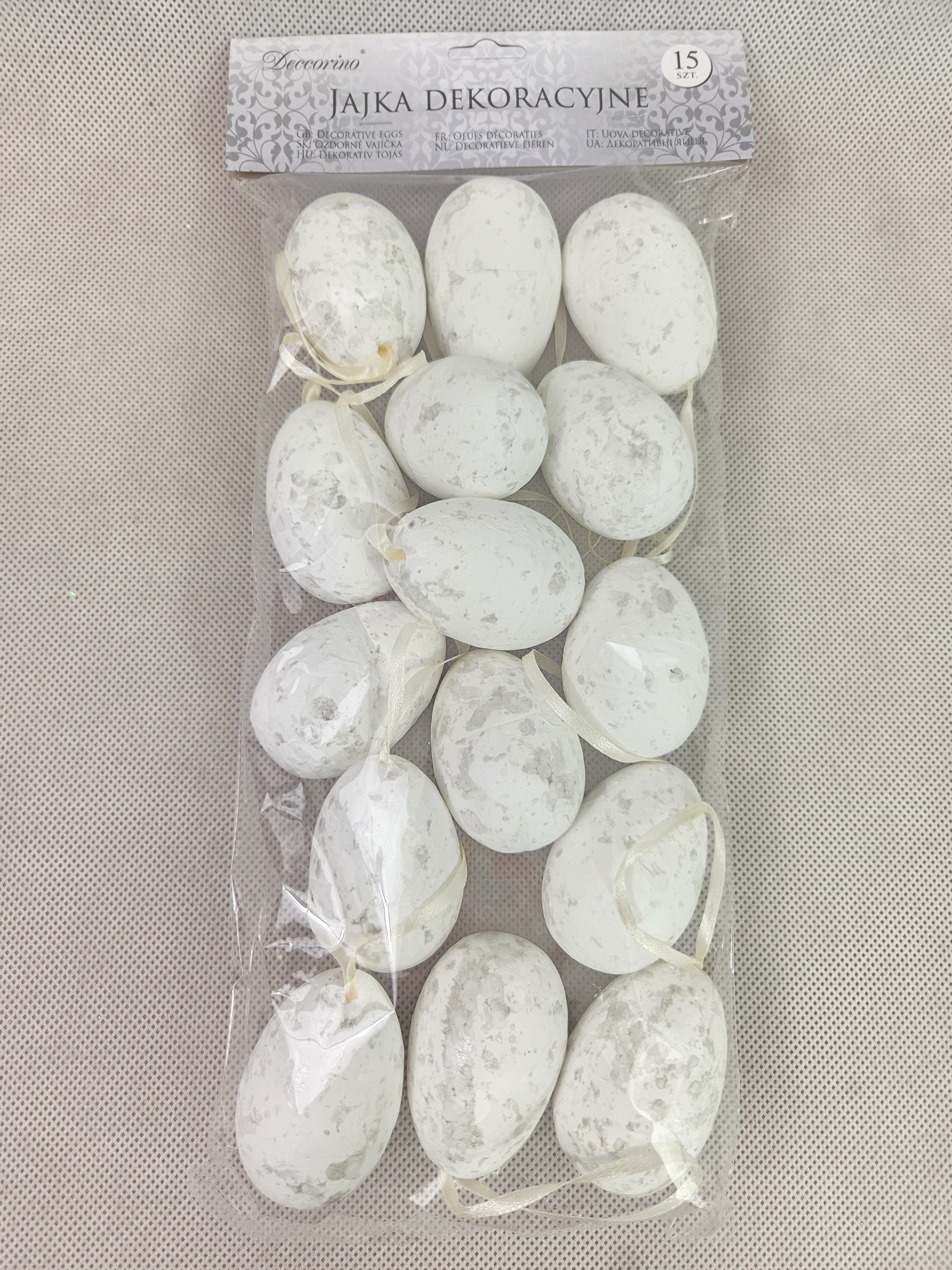 Jajka dekoracyjne 15 sztuk w zestawie. Wielkość jajka : 6 cm. Tylko kolor biały. pak. 120/luz