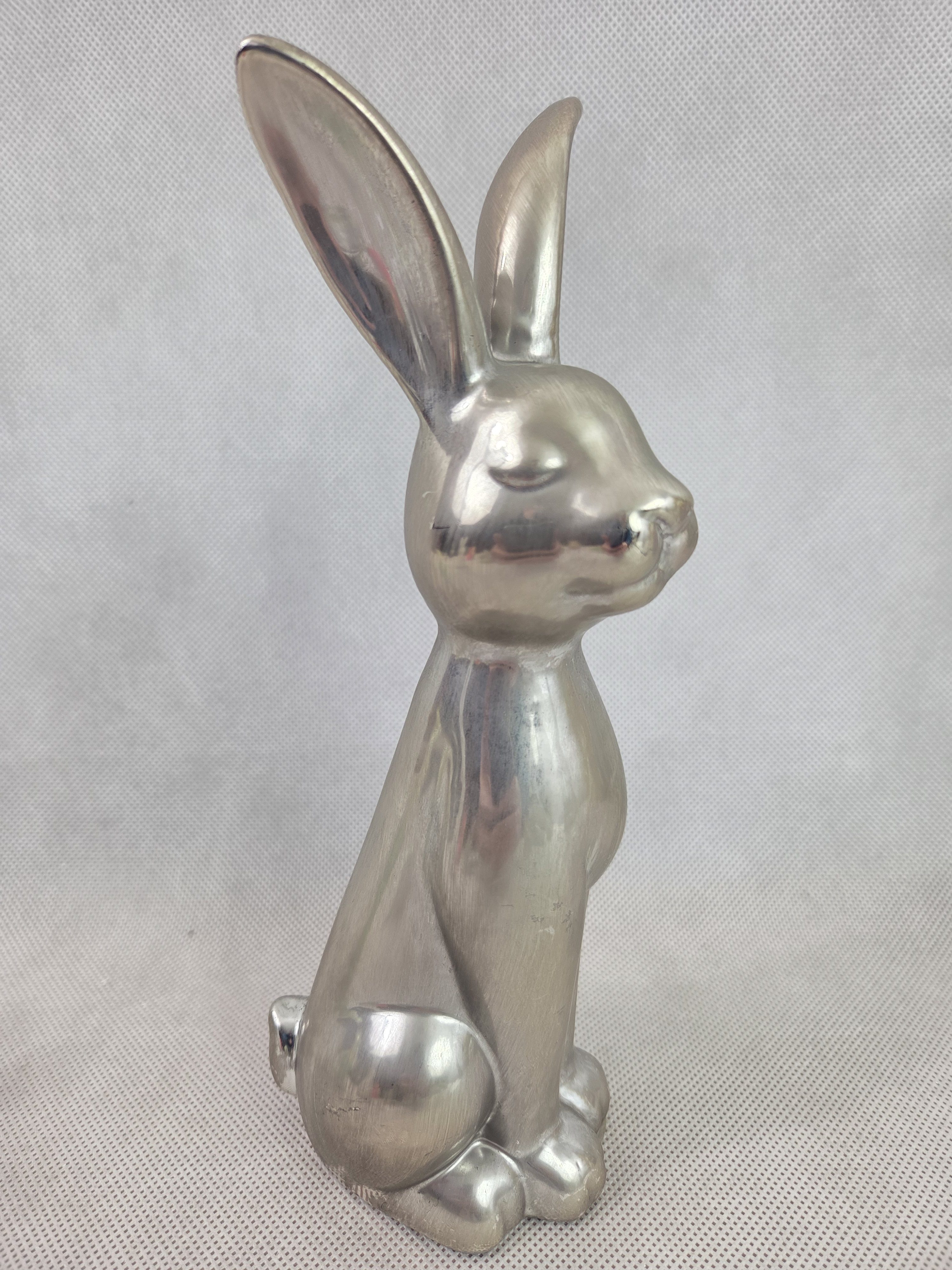 Figurka ceramiczna w kształcie królika o wymiarach  8,7x7x24 cm. Tylko kolor srebrny. pak. 12/luz