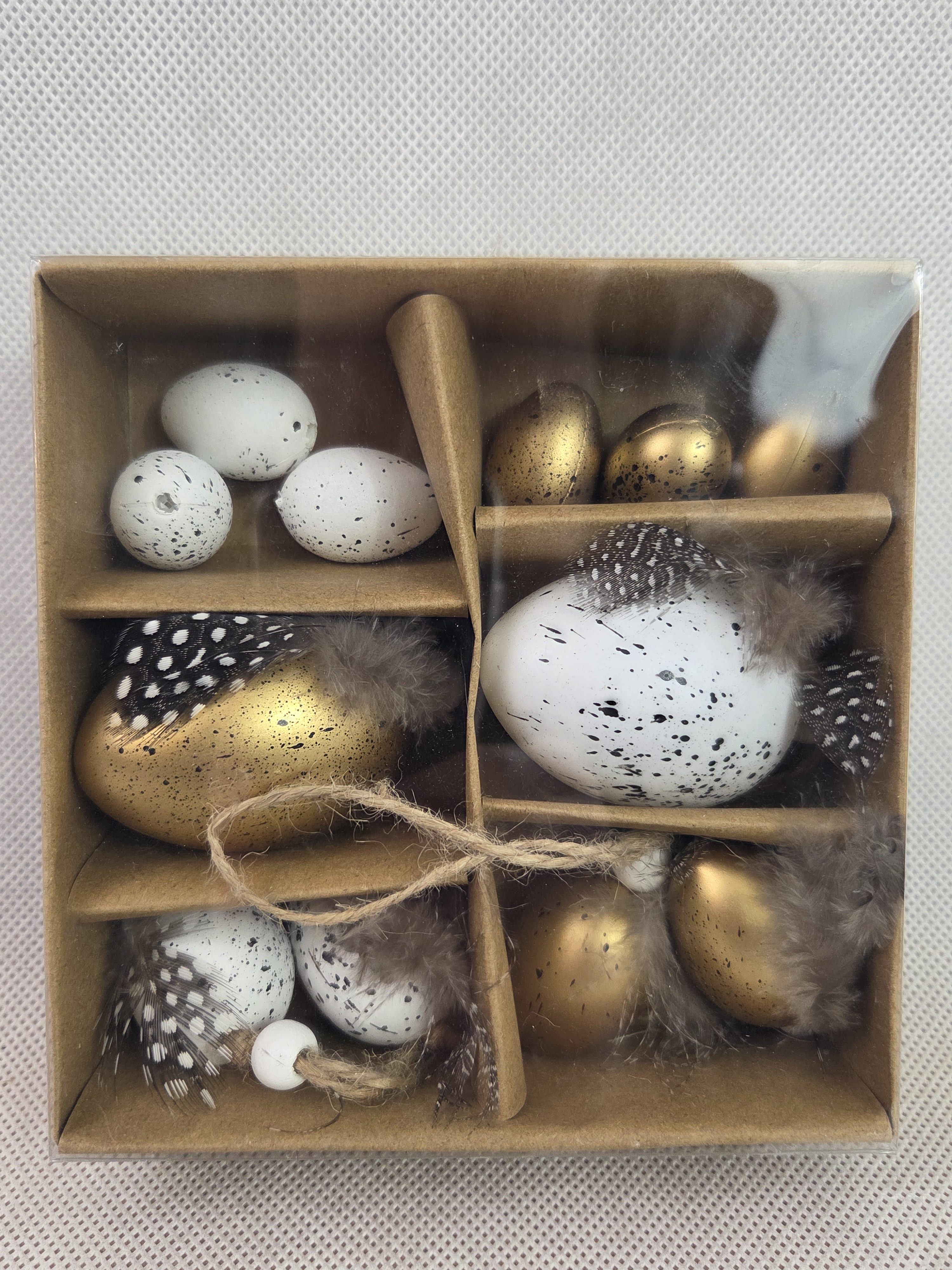 Zestaw 12 sztuk ozdobnych jajek w pudełku. Wymiary opakowania : 13×13 cm. pak. 120/luz